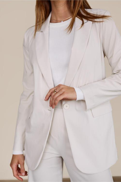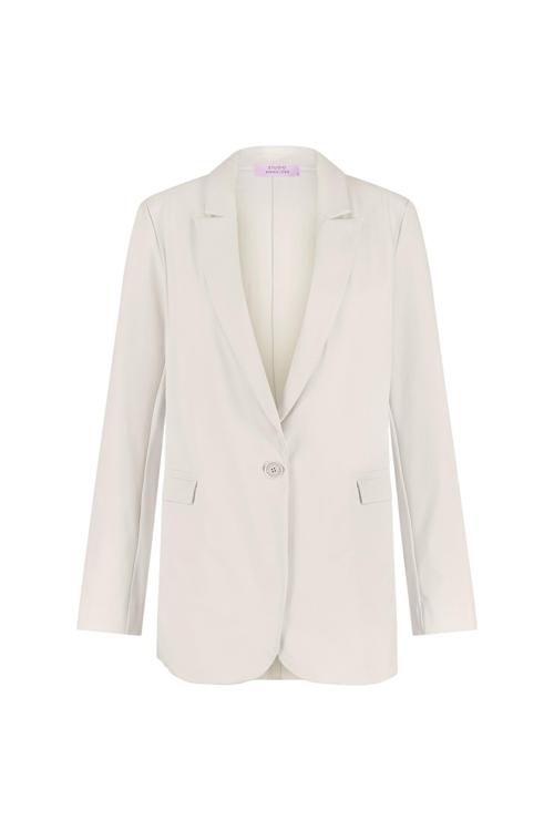 De Studio Anneloes Fran blazer biedt een elegante uitstraling met een soepel vallende pasvorm, ideaal voor diverse gelegenheden. Deze crèmekleurige blazer heeft een subtiele, effen afwerking en een klassieke V-hals met lange mouwen, waardoor het een veelzijdig item is in elke garderobe.