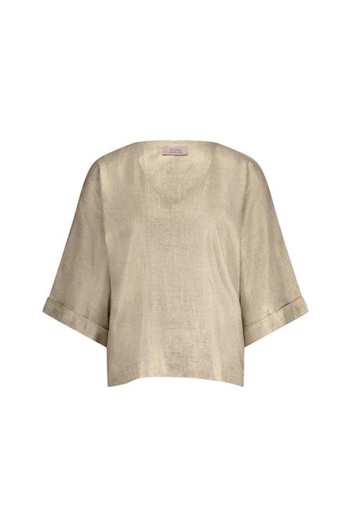 Deze elegante Madison gold linen top biedt een perfecte mix van comfort en stijl, ideaal voor elke dag. Met een soepele pasvorm en een zachte gouden tint straalt dit item verfijning uit. De top heeft een ronde hals en korte mouwen, wat zorgt voor een tijdloze uitstraling.
