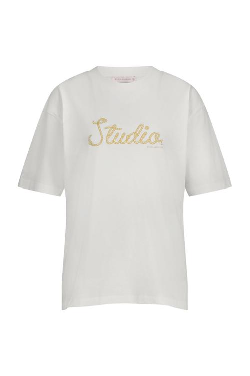 Verwen jezelf met het unieke Studio Anneloes Klaske rope tshirt. Dit witte item, voorzien van een speelse logoprint met het woord "Studio" in stijlvolle letters, biedt een comfortabele en flatterende pasvorm. De ronde hals en korte mouwen maken het tot een veelzijdige keuze voor verschillende gelegenheden, van een casual dagje uit tot een ontspannen werkdag.