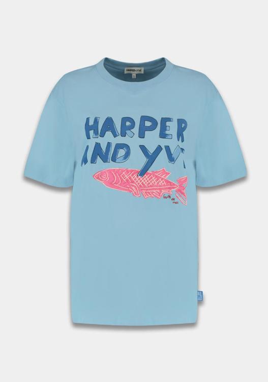 Dit Harper & Yve T-Shirt HS25Y306 is een echte blikvanger. Met zijn losvallende pasvorm en ronde hals biedt het ultiem comfort. Het item is lichtblauw en voorzien van een opvallende print met de tekst "HARPER AND YVE" in speelse letters, gecombineerd met een roze vismotief. Het is een perfecte keuze voor wie houdt van expressieve en unieke stukken in de garderobe.