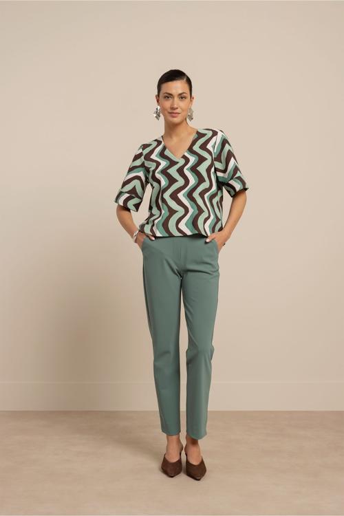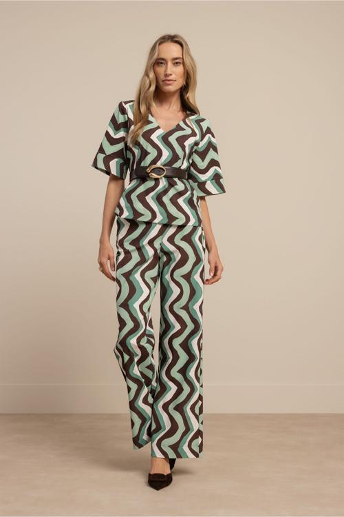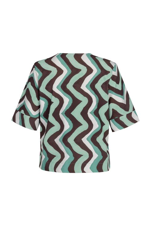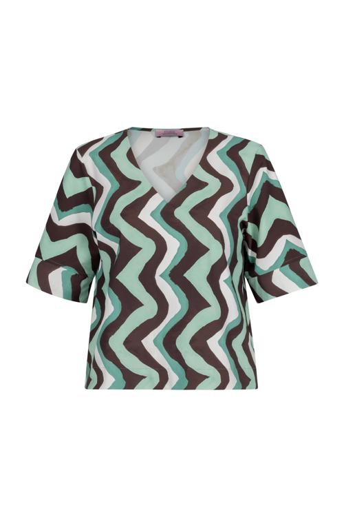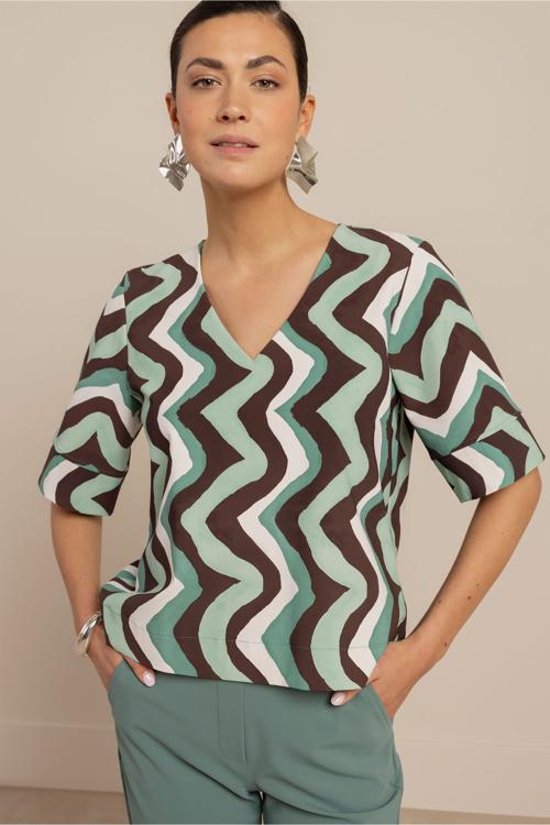 De Studio Anneloes Chantou zigzag top brengt een speelse twist aan je garderobe. Deze blouse valt op met haar levendige zigzag patroon in de kleuren groen, bruin en wit. De V-hals en korte mouwen maken het een veelzijdig item voor elke dag.