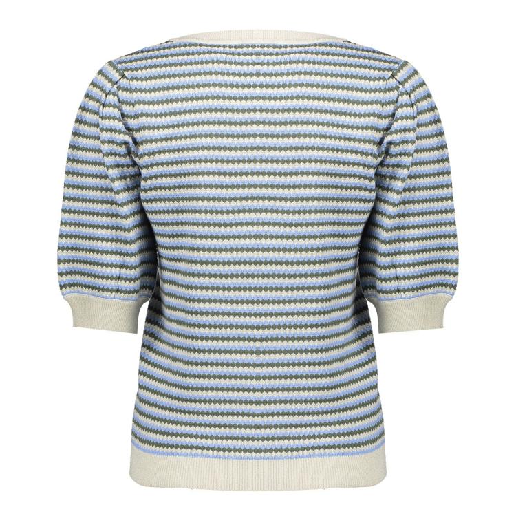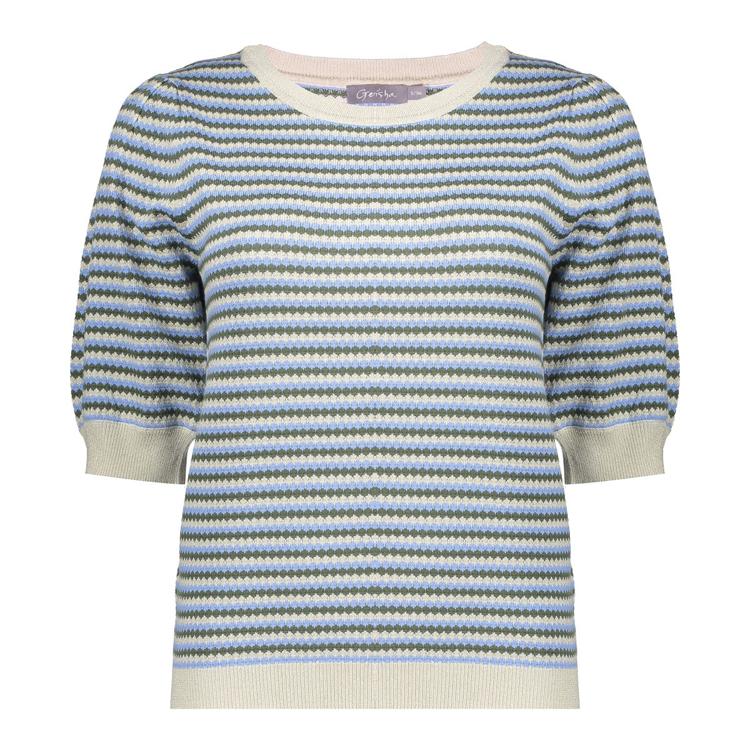 De Geisha Trui 64066-14 combineert comfort en stijl op een speelse manier. Dit item heeft een ontspannen pasvorm met een ronde hals en korte mouwen. De trui heeft een klassiek streeppatroon in blauwtinten met witte accenten, waardoor hij een frisse uitstraling krijgt.