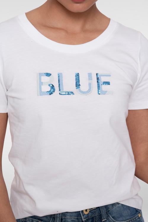 - Witte kleur met opvallende blauwe tekstprint