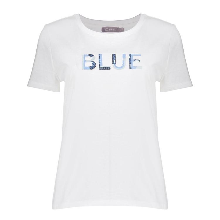 Verfris je look met het Geisha T-Shirt 62136-41. Dit item is ontworpen met een comfortabele pasvorm en een ronde hals, waarbij de korte mouwen ideaal zijn voor een casual uitstraling. Het t-shirt komt in het wit en is voorzien van een opvallende blauwe tekstprint "BLUE" op de voorkant, wat een speelse touch toevoegt aan je outfit.